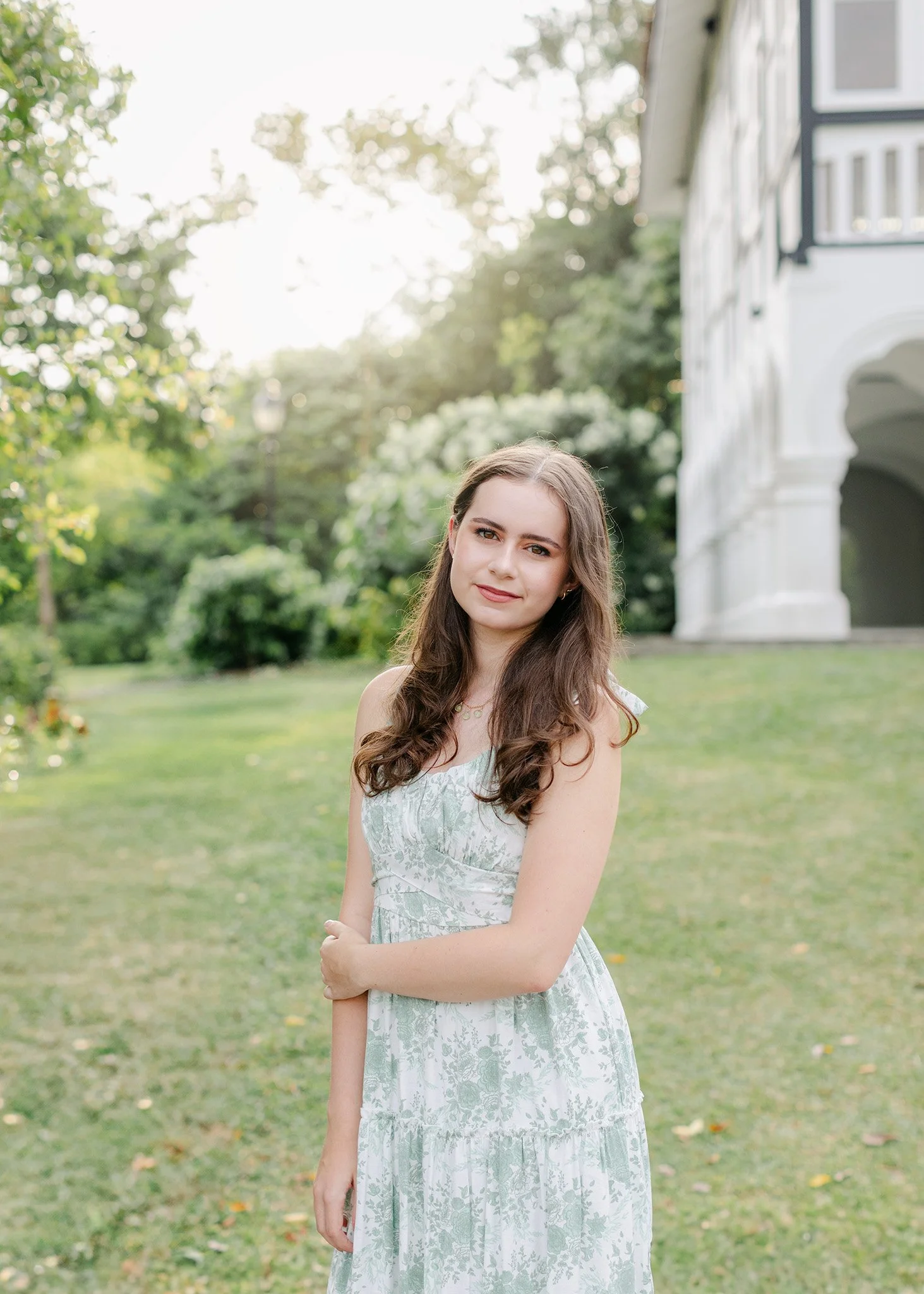 This senior came prepared, which honestly makes such a difference. The mint green floral dress was perfect against all that greenery, and we timed everything just right for that golden hour magic around 5:30 PM.